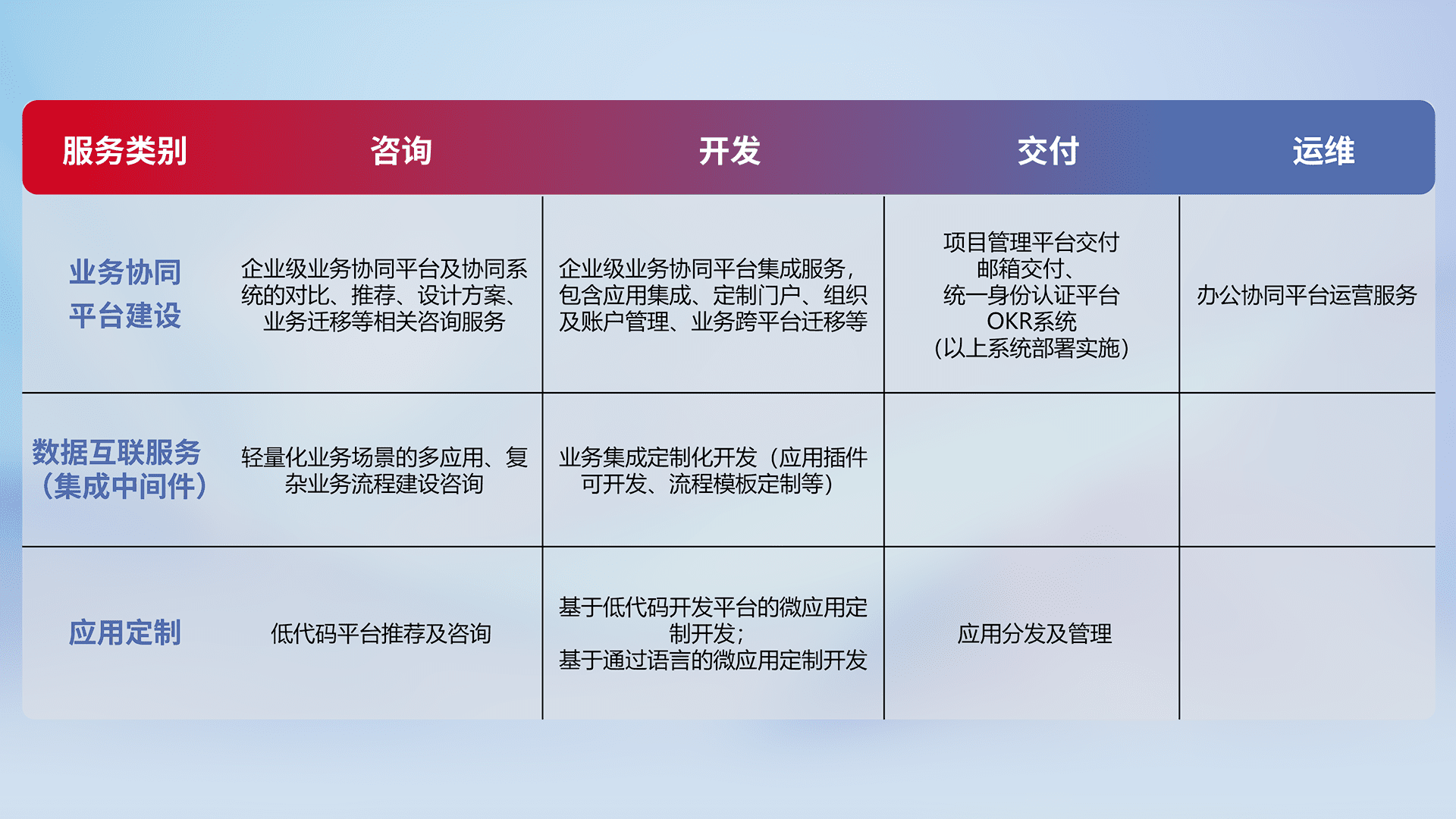 针对钉钉、、、企微、、、、IDaas等平台级产品提供产品的规划、、、、方案、、、交付、、、定制化开发等服务,,,,实现如统一协同办公、、、智能客户服务、、混合会议管理、、智能数据查询、、等业务场景,,,实现数字化转型。。。。